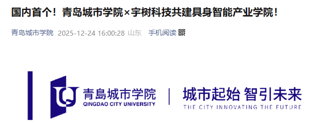 宇树科技公司。现正在,这所公司曾经成长为占领全球四脚机械人市场60%-70%份额的带领者,并取DeepSeek等5所立异企业一路,并称为“杭州六小龙”。比来,这所全球具身智能领军企业宇树科技,取一所本科高校——青岛城市学院,配合成立了全国首家宇树科技财产学院,将配合培育具身智能时代使用型人才。12月23日,青岛城市学院取宇树科技正式签订计谋合做和谈,配合成立宇树科技财产学院,具身智能产教融合新。